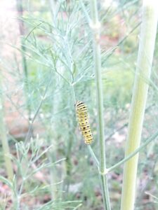 caterpillars. Those caterpillars need to eat in order to turn into butterflies, and often, what they are eating is what you have planted in your gardens. I had a customer in the store ask me how to get rid of the caterpillars that were eating his fennel every year. My answer was that he should just plant more fennel, so there would be enough for both him and those caterpillars, because they turn into beautiful black swallowtail butterflies!